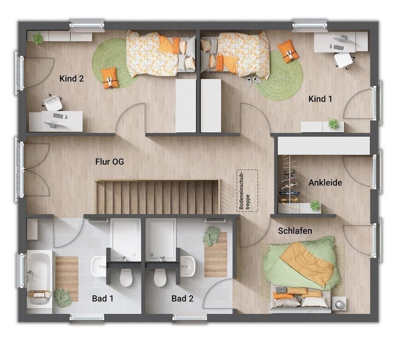 - Eltern- und Kinderbereich im Obergeschoss getrennt durch den Flur