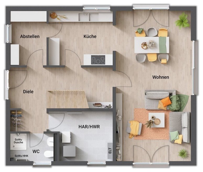 - aufgeräumtes/cleanes Erdgeschoss (Trennung des „technischen“ Bereichs (Hausanschlussraum, WC, Arbeit) vom „gesellschaftlichen“ Bereich (Wohnen, Kochen)