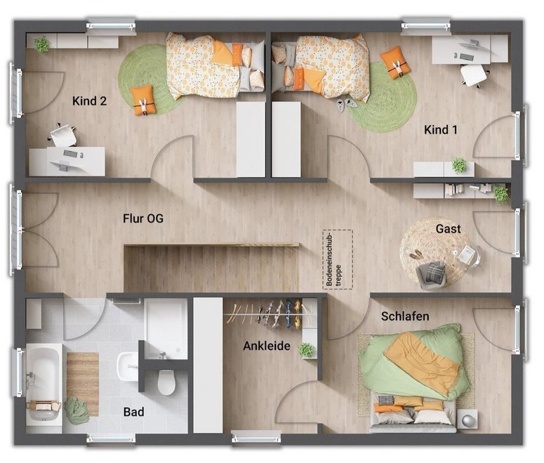 Auch das Obergeschoss zeigt sich im gradlinigen Baustil des Hauses. Hier finden Sie drei Zimmer, die Sie nach Ihren Vorstellungen als Schlaf-, Kinder- oder Gästezimmer nutzen können. Große Fenster lassen auch hier viel Tageslicht hineinströmen. Die Ankleide im Schlafzimmer bietet viel Stauraum.